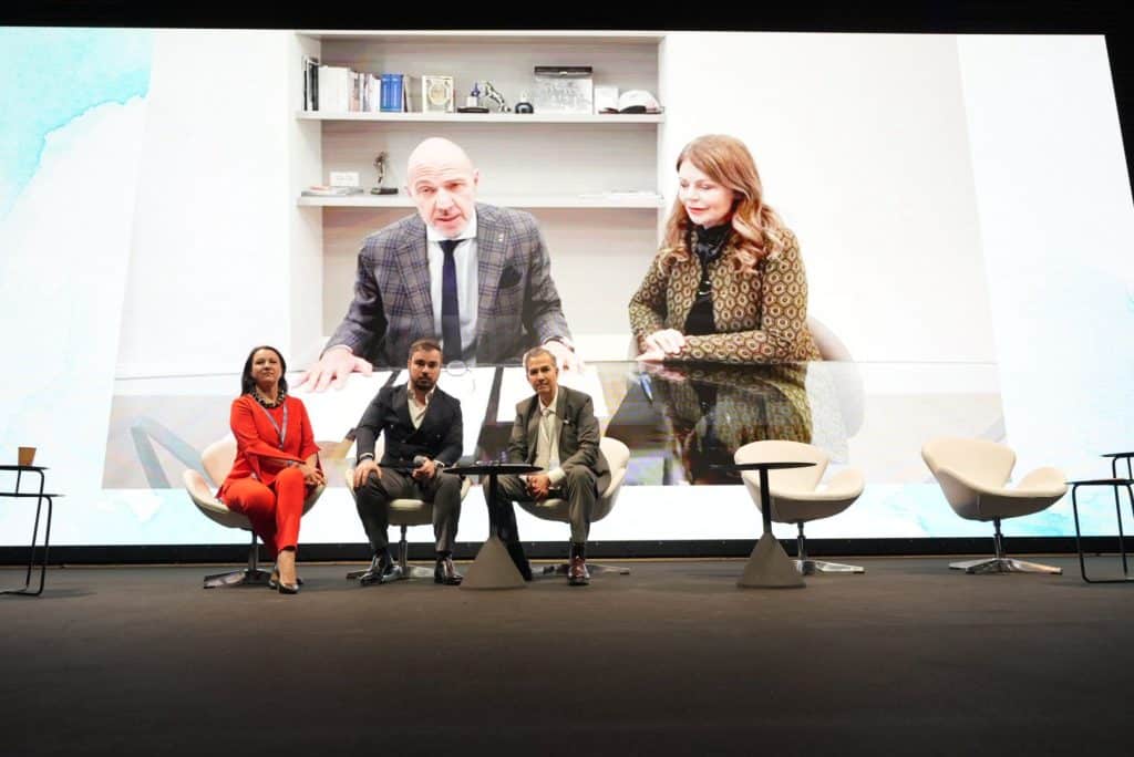 Pie de foto | De izq. a dcha.: Dra. Edyta Adamczyk-Kutera, vicepresidenta de la Sociedad Polaca de Medicina Estética; Dr. João Vale, presidente de la Sociedad Portuguesa de Medicina Estética; Juan Antonio López-Pitalúa, presidente de SEME; y en pantalla el Dr. Emanuele Bartoletti y la Dra. Stefania Santini, presidente y secretaria general de SIME.