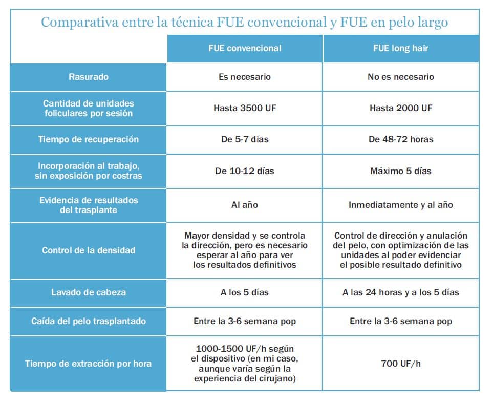 La principal diferencia entre el trasplante FUE convencional y el trasplante long hair reside en que el último no requiere rasurar al paciente: el pelo se extrae largo se implanta largo